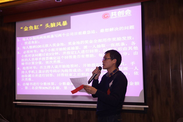 本次會(huì)議流程簡要:每人分別用兩張紙條寫兩個(gè)公司目前最急迫、最想解決 問題,放進(jìn)魚缸,然后開始輪流按規(guī)則抽簽、思考、討論、解決。