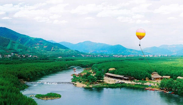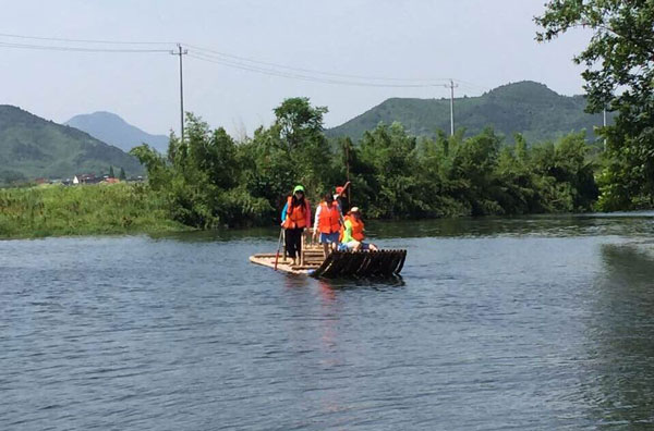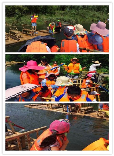 全長水路3.5公里,歷時(shí)一小時(shí)左右,由專業(yè)筏工點(diǎn)篙撐筏,順莫干山、天目山支流匯合雙溪而下。溪水清澈明凈,水面時(shí)有翠鳥、鴨子等出沒,兩岸茶山蔥籠,淡竹林綿延不絕。溪邊有“苧翁垂釣”、“村姑搗衣”,實(shí)屬一幅天然水墨風(fēng)情畫,都市喧囂在此蕩然無存,令總裁們也卸下了平日繁重的工作包袱,與孩子們置身于秀美山水之間,盡情享受著天倫之樂。