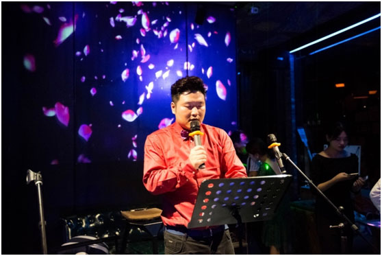 首先登場——共創(chuàng)會“頭牌巨星”海寧朗舜皮草有限公司總經(jīng)理諸為忠,演繹歌曲《聽?!罚珗鰵夥账查g被點燃。