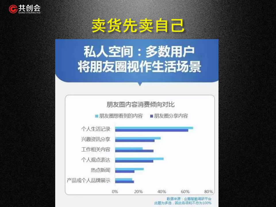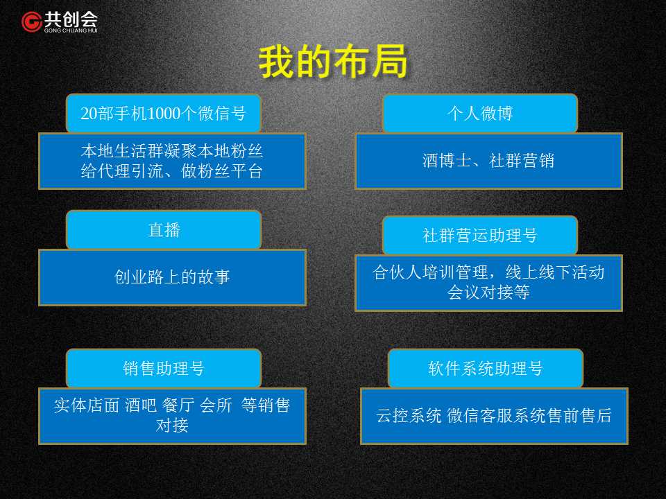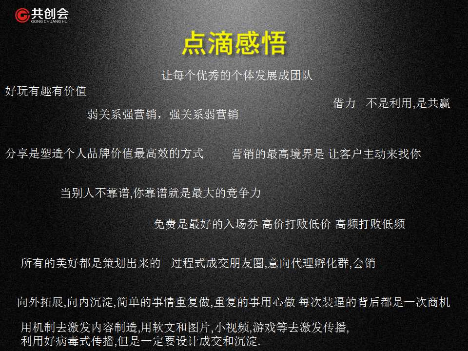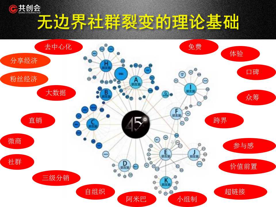 15年傳統(tǒng)電腦批發(fā)生意成功轉型社交電商的二次創(chuàng)業(yè),在共創(chuàng)會的平臺上,他學習中實踐,實踐中成長,見證了45度冰從500萬到2.6億的過程,短短兩年的時間里,他通過社群營銷思維,開啟了W2W(wide to wide)的探索,1萬個微信號的自媒體營運,用5000萬粉絲為紐帶,成為了一個超級鏈接者!(大拇指!)