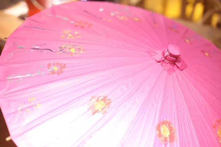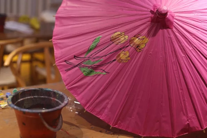 油紙傘DIY現(xiàn)場(chǎng)準(zhǔn)備了空白的油紙傘、調(diào)色盤(pán)、涂料和畫(huà)筆等……