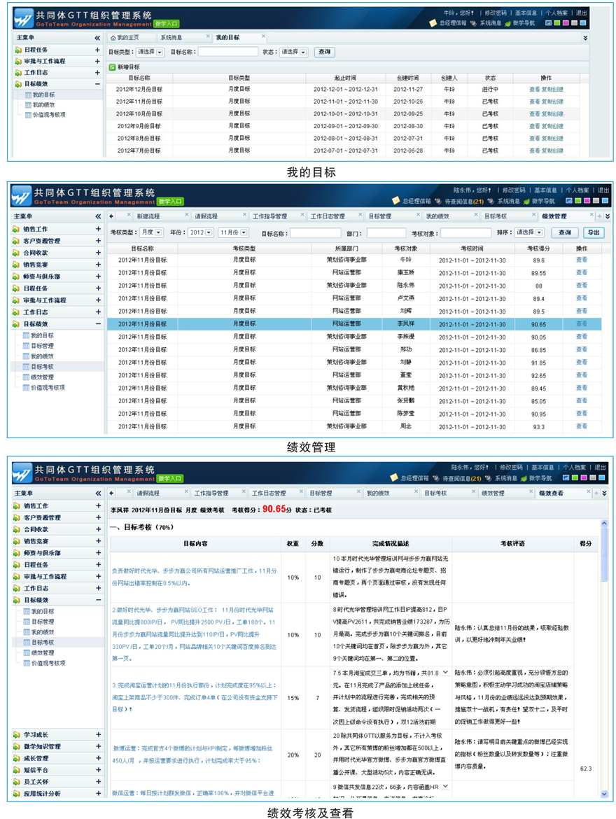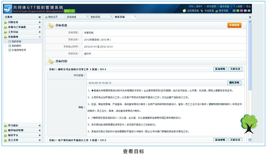GSPDCA目標(biāo)績效考核體系,是通過(1)對(duì)企業(yè)戰(zhàn)略目標(biāo)的分析(G:goal,目標(biāo)), → (2)找出戰(zhàn)略實(shí)施的關(guān)鍵成功因素(S strategy 策略), → (3)在此基礎(chǔ)上確定企業(yè)的關(guān)鍵績效指標(biāo)等目標(biāo)實(shí)施計(jì)劃(P plan 計(jì)劃),然后分解為業(yè)務(wù)單位、職能部門和個(gè)人崗位指標(biāo),通過目標(biāo)的層層分解,建立起基于公司戰(zhàn)略的績效目標(biāo)體系,使每個(gè)部門、崗位的努力都與企業(yè)的戰(zhàn)略目標(biāo)要求相一致,將企業(yè)的戰(zhàn)略目標(biāo)轉(zhuǎn)化為員工的績效責(zé)任。 → (4)通過上級(jí)向下級(jí)發(fā)布任務(wù),下級(jí)向上級(jí)提交任務(wù),同事之間協(xié)同任務(wù),任務(wù)大廳領(lǐng)取任務(wù)等方式來增加經(jīng)驗(yàn)值(D do 執(zhí)行),提升自我的價(jià)值和增進(jìn)員工之間的默契。 → (5)提交任務(wù)執(zhí)行反饋、工作日志,最后領(lǐng)導(dǎo)通過檢查指導(dǎo)(C check 檢查), → (6)其中需要修正的,及時(shí)反饋于下屬修正完善(A action 修正),直至完成目標(biāo)。